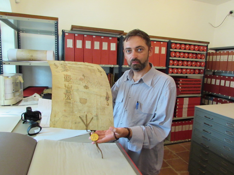 В архиве афонского монастыря Хиландар, в руках оригинал грамоты царя Ивана Грозного с золотой печатью