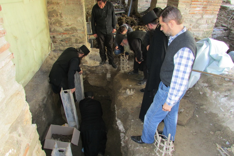 На археологических раскопках в главном храме Протата Афона, во время которых были обнаружены останки афонских монахов, убитых каталонскими пиратами в нач. XIV в., ноябрь 2015