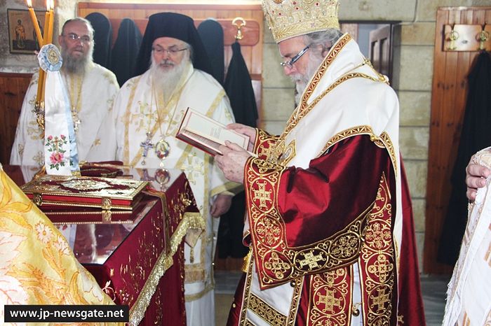 At this historical monastery that was restored at the beginning of the 20th century by monks Leontios and Galaktion, then in the mid-20th century by Archbishop Bartholomew of Madava and in our days by the hegoumen, Archimandrite Ierotheos, the feast was observed with a Divine Liturgy led by the Patriarchal Commissioner, Metropolitan Isychios of Kapitolias. Co-officiating were Archbishop Theophylaktos of Jordan and Metropolitan Joachim of Zambia, Archimandrite Ignatios, fathers Ieronymos and Modestos, the master of ceremonies, Fr. Bartholomew, Fr. Seraphim visiting from the Church of Greece, Hierodeacons Charalambos and Markos, and Arabic-speaking priests from the Village of the Shepherds. Monks of the Lavra of Hosios Savva sang in Greek, with members of the Orthodox youth of the Village of the Shepherds singing in Arabic. A great crowd of faithful participated in the service for their salvation and the glory of God.