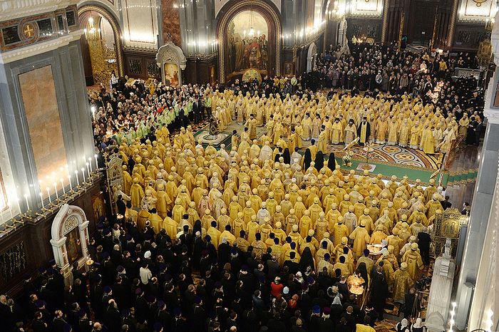 The Primate of the Russian Orthodox Church was concelebrated by: Metropolitan Onufry of Kiev and All Ukraine; Metropolitan Juvenaly of Krutitsy and Kolomna, Patriarchal Vicar of the Moscow diocese; Metropolitan Vladimir of Chisinau and all Moldova; Metropolitan Alexander of Astana and Kazakhstan; Metropolitan Vikenty of Tashkent and Uzbekistan, head of the Central Asian Metropolitan District; Metropolitan Varsonofy of St. Petersburg and Ladoga, Chancellor of the Moscow Patriarchate; Metropolitan Pavel of Minsk and Zaslavl, Patriarchal Exarch of all Belarus; Metropolitan Hilarion of Volokolamsk, chairman of the Department for External Church Relations of the Moscow Patriarchate; Metropolitan Hilarion of Eastern America and New York, First Hierarch of the Russian Church Abroad; Metropolitan John of Varna and Velikopereslavl (Bulgarian Orthodox Church); Bishop Arseny, Vicar of the Archdiocese of Plovdiv (Bulgarian Orthodox Church) as well as ruling and vicar bishops of the Russian Church who arrived in Moscow for the Holy Council of Bishops of the Russian Orthodox Church. The Administrator of the Patriarchal Parishes in the USA, His Grace Bishop John of Naro-Fomisnk joined the hierarchs in Moscow to congratulate His Holiness and to participate in the work of the Holy Council of Bishops.
