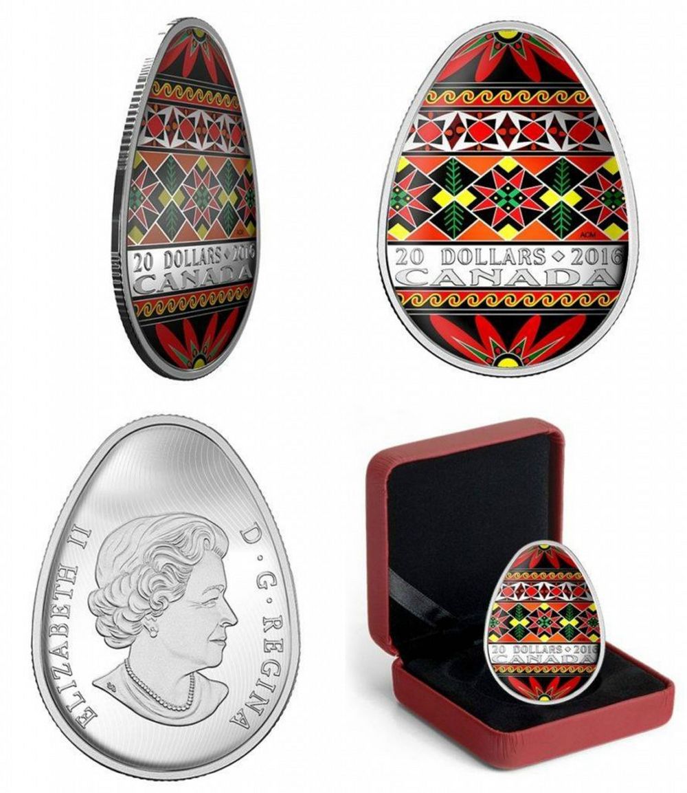 The Royal Canadian Mint is planning to issue on February 2, 2016 a 1 oz. Fine Silver Coloured Coin "Traditional Ukrainian Pysanka" with a low mintage of 4,000. This is the first-ever egg-shaped coin issued by the Royal Canadian Mint.
