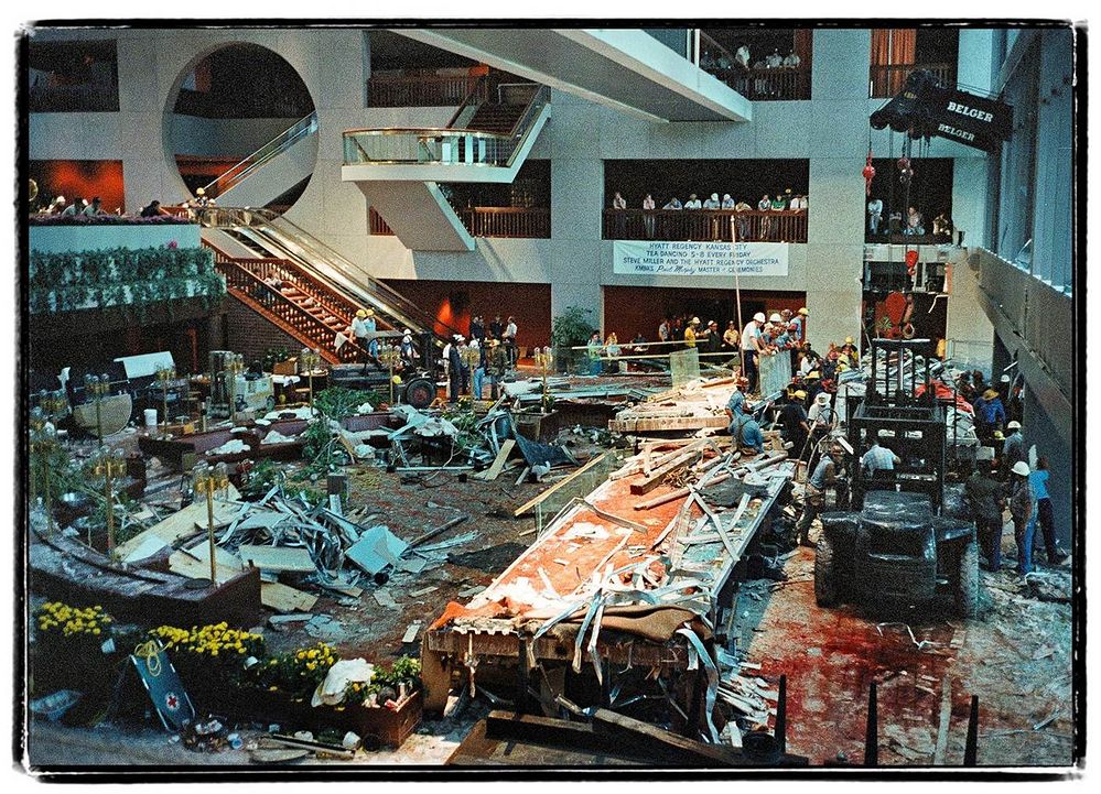 Как я узнала позднее, мы оказались жертвами катастрофы: две подвесные галереи гостиницы, спроектированные с техническими ошибками, не выдержали веса конструкций и стоящих на них людей и обрушились. Они убили 114 человек и тяжело ранили 216. До 2001 года это было самое смертоносное в истории США разрушение рукотворного объекта. Этот страшный рекорд был побит только в 2001 году во время обрушения Южной башни Всемирного торгового центра в Нью-Йорке.