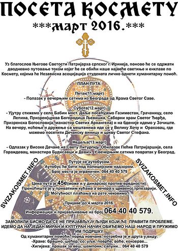 Уз благослов Његове Светости Патријарха српског г. Иринеја, поново ће се одржати дводневно путовање током којег ће се обићи наше највеће светиње и енклаве по Космету, којима ће Независнa асоцијацијa студената лично однети хуманитарну помоћ.