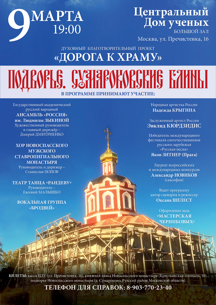 9 марта 2016 г. в 19:00 в концертном зале Центрального дома ученых г. Москвы по адресу улица Пречистенка д. 16 в рамках проекта «Дорога к храму» состоится театрализованный масленичный концерт-гуляние «Подворье. Сумароковские блины».