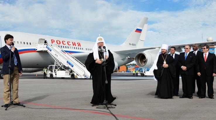 «Я являюсь Патриархом не только Московским, но и всея Руси. И передаю привет от всех народов исторической Руси», — сказал журналистам Предстоятель Русской Церкви по прибытии в аэропорт Гаваны. В поездке Патриарха сопровождают председатель Отдела внешних церковных связей РПЦ митрополит Иларион, управляющий делами Украинской Православной Церкви Московского Патриархата митрополит Антоний и ряд других высокопоставленных архиереев.