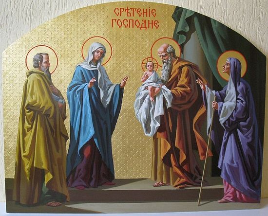В то время жил в Иерусалиме праведный старец Симеон. Ему было откровение, что он не умрет, пока не увидит Христа Спасителя. По внушению свыше благочестивый старец пришел в храм в то время, когда Пресвятая Богородица и праведный Иосиф принесли туда Младенца Иисуса. Богоприимец Симеон взял Богомладенца на руки и, благословив Бога, изрек пророчество о Спасителе мира: Ныне отпускаешь раба Твоего, Владыка, по слову Твоему с миром, ибо видели очи мои спасение Твое, которое Ты уготовал пред лицем всех народов, свет к просвещению язычников и славу народа Твоего Израиля (Лк. 2, 29–32). Пресвятой Деве праведный Симеон сказал: Се лежит Сей на падение и на восстание многих в Израиле и в предмет пререканий, и Тебе Самой оружие пройдет душу, да откроются помышления многих сердец (Лк. 2, 35). В храме была также 84‑летняя вдовица Анна, пророчица, дочь Фануилова, которая не отходила от храма, постом и молитвой служа Богу день и ночь. И она в то время, подойдя, славила Господа и говорила о Нем (Богомладенце) всем, ожидавшим избавления в Иерусалиме (Лк. 2, 37–38).