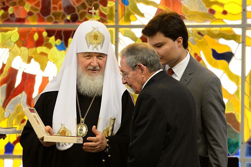 По завершении беседы Рауль Кастро и Святейший Патриарх Кирилл обменялись подарками. Рауль Кастро передал в дар Его Святейшеству барельефное изображение святого великомученика Георгия Победоносца. Предстоятель Русской Церкви вручил Председателю Госсовета Кубы настольную икону Покрова Пресвятой Богородицы и свою книгу «Свобода и ответственность» в переводе на испанский язык.