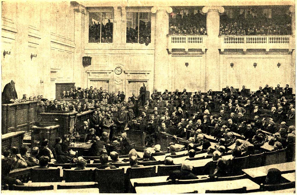 Быстренько выбрав председателем Думы московского профессора римского права Муромцева, государевы люди сразу же приступили к государеву делу. Первым выскочил на трибуну заслуженный оппозиционер кадет Петрункевич.