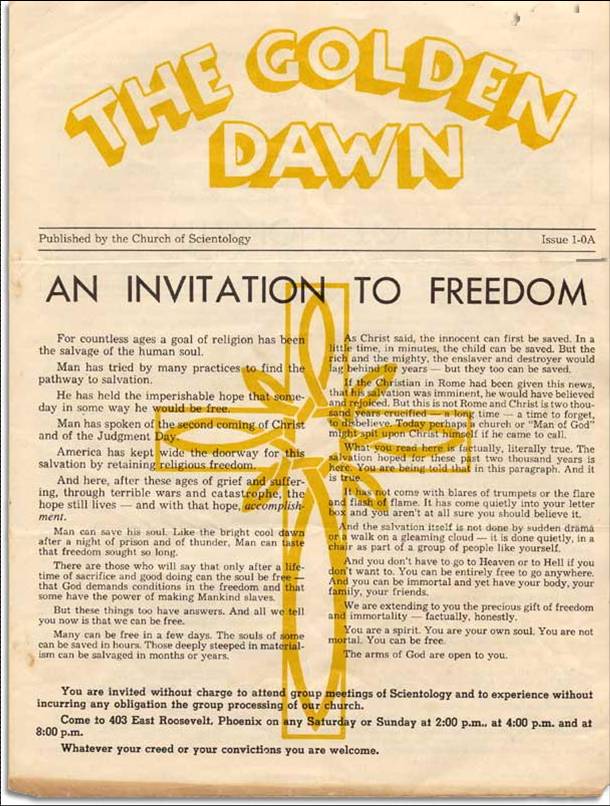 Ево, на пример, сајентолошког летка који је издат за Хабардовог живота, и који носи назив «Златна зора» (тако се зове окултна ложа која је изнедрила Алистера Кроулија).