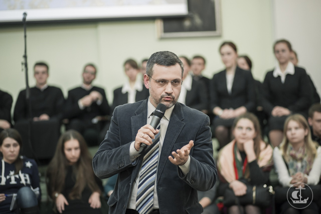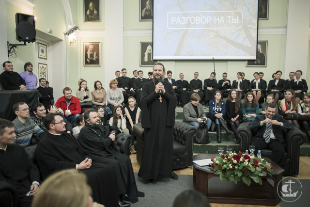 Встречу открыл ректор Духовной Академии архиепископ Амвросий, представив гостей Северной столицы — создателей и участников популярного социально-просветительского проекта «Разговор на ты»: протоиерея Павла Великанова, доцента Московской духовной академии, Главного редактора портала Богослов.RU, председателя Синодального отдела по взаимоотношениям Церкви с обществом и СМИ Московского Патриархата главного редактора журнала «Фома» Владимира Романовича Легойду и руководителя проекта диакона Анатолия Колота.