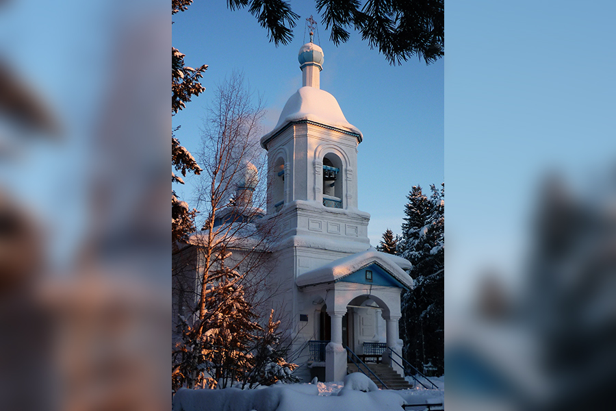 Впечатление, что я попал в сказку, усилилось при въезде в Яренск, где стоит храм Всех Святых, окружённый со всех сторон разлапистыми соснами. Перед входом – рождественские ёлочки и вертеп из снега. Спешу на могилку старца Феогноста, похороненного около алтаря 15 лет назад. Могилка ухожена, на ней лежат свежие цветы, стоят свечи – видно, что батюшку почитают. Рядом средь вековых сосен похоронена и матушка Серафима – келейница, пережившая его почти на пять лет.