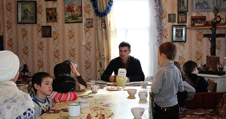 Их пятеро, от пяти до двенадцати лет, а младшему – всего восемь месяцев, он пока большую часть времени проводит на руках у мамы. В доме постоянное коловращение, детские голоса: мальчишки топят печи, носят воду и дрова, девочки помогают прибираться и мыть посуду. В центре всего этого движения – пушистая новогодняя ёлка в большой комнате, сияющая огоньками. Разговор с о. Адамом то и дело прерывается телефонными звонками прихожан. Отец настоятель вместе с матушкой Надеждой много занимаются не только своими детьми, но и воспитанием и приведением к Богу детей прихожан, считая это очень важным делом. В эти рождественские праздники дети из воскресной школы ходят по домам с колядками, несут благую весть о родившемся Христе.