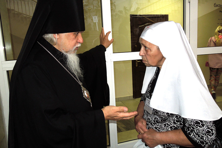 Старшая сестра Александра Перькова советуется с председателем Синодального отдела по благотворительности епископом Пантелеимон