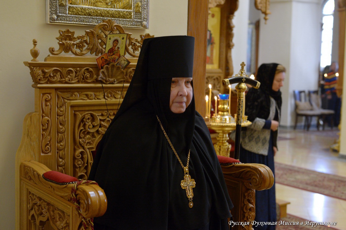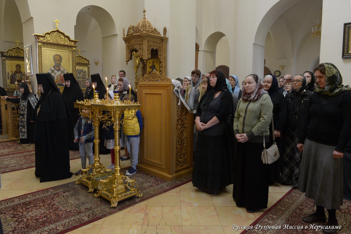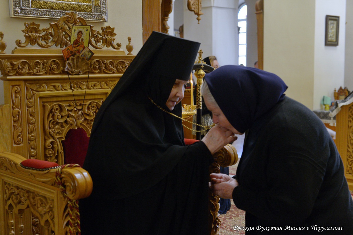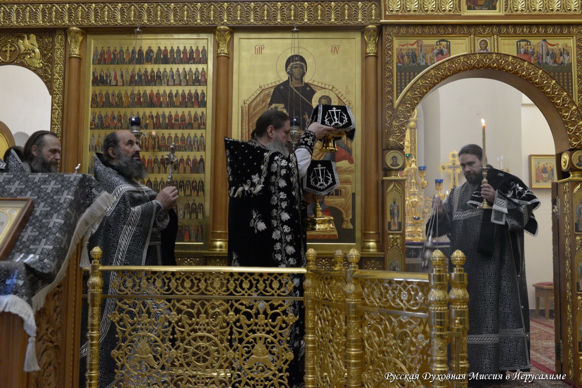 25 марта Литургию Преждеосвященных Даров в соборе Всех святых в земле Русской просиявших в обители совершил Начальник Русской Духовной Миссии архимандрит Александр (Елисов) в сослужении клириков монастыря и паломников в священном сане. Матушка игумения причастилась в этот день Святых Христовых Таин.