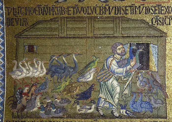 Ной забирает в ковчег животных, которых Бог ему определил. Церковное древнее еврейское предание сообщает нам, что в ковчеге было три яруса: отдельно для людей, для хищников, для травоядных. В этом ковчеге было тесно и темно, двери ковчега закрыл Бог Сам. А руля, парусов, каких-то снастей не было. Огромный ящик, набитый живыми существами, которые послушно зашли в него в нужном количестве. И потом полилась вода так, что размокли горы. Полилась вода, открылись небесные хляби. В описании творения Божиего мира сказано: «да будет твердь посреди воды, и да отделяет она воду от воды» (Быт. 1: 6). Вода, которая под твердью, – это то, что мы называем системой кругообращения воды в природе. А воды над твердью – это воды, которые находятся в черных пустынях космоса. Так вот, открываются некие небесные двери, и льется какая-то мистическая вода. Это не просто вода дождя, это какая-то жуткая вода из-за тверди, вода уничтожения, вода наказания, которая губит все, что имеет дыхание жизни в ноздрях своих. Ковчег болтается по волнам, сотрясается от грохота, набившие его живые существа в жутком ужасе… И в этом смысле ковчег тоже есть образ Церкви. Вообще в церквах должно быть тесно от молящегося народа. Плохо, когда церковь совершенно пуста и там нет никого, только стоит батюшка в алтаре да певец на клиросе. Хорошо, когда в храме много людей и все молятся. Эта теснота не должна быть в обиду, потому что мы все в ковчеге.