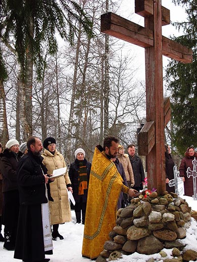 – Нет. Там, где их похоронили, раньше находился холм. На могиле сразу же после похорон был воздвигнут большой крест. И табличка с именами всех убиенных была. Но поскольку на поклонение к могиле приходили люди, это место почитания власти разрушили: сровняли холм, убрали крест. И люди постепенно забыли, где находится могила новомучеников. Когда я сюда приехал, мне это место показала одна прихожанка. Рядом были уже свежие захоронения, но земля, где лежат мученики, осталась нетронутой. Так Господь промыслительно оберегал это место. У меня поначалу какие-то сомнения были, но они развеялись после того, как мне прислали фотографии кладбища, сделанные сразу же после похорон. Рядом находится старинный кладбищенский храм Петра и Павла, который не закрывался всё советское время. Долго – до восстановления Преображенской церкви – я служил там. Двадцать лет назад ещё оставались верующие, которые помнили и поминали казнённых.