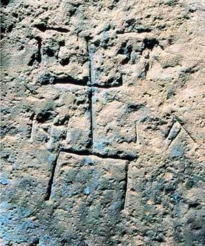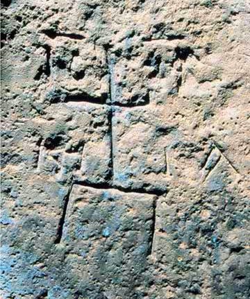 Изображение креста в алтарной части пещерного храма в честь Архистратига Михаила. Изображение датируется домонгольским периодом.