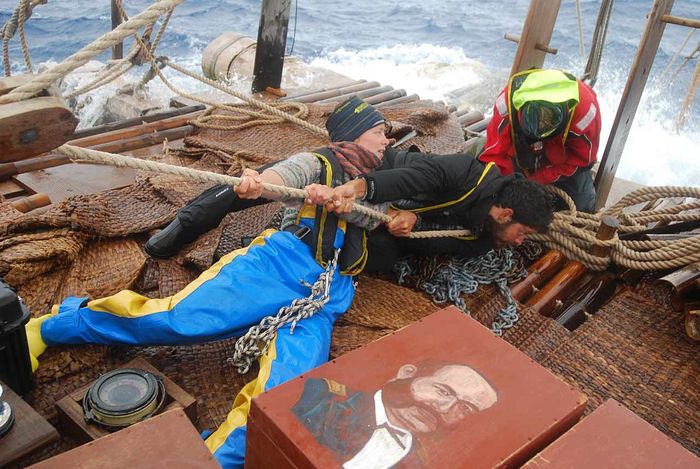 Два раза в сутки на Большую землю передавались метеорологические отчеты. Представьте себе: дождь, большие волны, ветер, холод, усталость, ночь! – а сам доктор Педро Де Ла Торре или его помощница, опытная норвежская путешественница Лив Арнесен (кстати, самая взрослая из всех!), встают и проводят измерения и отправляют рапорты. На бортах плотов «Кон-Тики–2» была установлена система спутниковой связи Iridium GO, через нее передавались и научные данные, и репортажи, статьи, фотографии на сайты, в СМИ, близким и друзьям по всему миру.