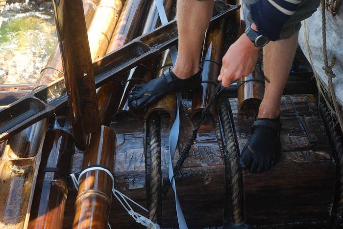 Сомнения, что мы дойдем до континента Южной Америки, стали превращаться из умозрительных в физические, когда обнаружились первые серьезные признаки износа главных веревок, скрепляющих бревна друг с другом. В подводной части веревки приобрели рыхлость, некоторые уже можно было разорвать руками. Причина стала ясно, когда кинооператор экспедиции Евгений Штиль получил сообщение от одного своего друга-биолога, который следил за ходом плавания: специалист четко описал процесс разрушения веревок, разъяснил, что этот процесс ведут зеленые водоросли, буквально захватившие плоты в свой плен. Всем знакомо, как самое крохотное растеньице пробивает в городе асфальт. И в океане тонюсенькие волокна водорослей прорастали внутрь веревок и постепенно разрывали их, как это делают ростки с асфальтом. Давление, которое развивает тоненькое тельце водоросли, на самом деле огромно, противостоять ему просто так невозможно: не поможет ни толщина веревок, ни их качество. Единственная защита – это современные ядовитые вещества: грунты, краски и пропитки на основе свинцовых соединений – против обрастания, но для плотов «Кон-Тики–2» это было неприемлемо. Веревки пропитывались лишь маслом, олифой, строители старались хоть чуть-чуть, но сохранить историческую достоверность конструкций. Наверное, древние инки мучились тем же вопросом: как защититься от мелких зеленых водорослей?! – или имели какие-то секреты, пропитывали веревки и не знали горя в долгих плаваниях. Мы можем только предполагать такие варианты.