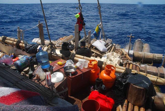 Туалет был оборудован чрезвычайно просто – это пластиковое ведро; были запасы туалетной бумаги, а для дезинфекции и гелевые санитарные жидкости. На плоту невозможно найти укромное место для туалета, а ведь бывали и такие дни, когда волны и ветер крушили плоты, опасно было даже просто находиться на искореженной бамбуковой палубе, тогда и для туалета не было места – обходились, как могли, но конфликтов по этому поводу не было. Именно наличие у людей опыта подобных экстремальных экспедиций имеет решающее значение для слаженной бытовой жизни и бесконфликности команды.