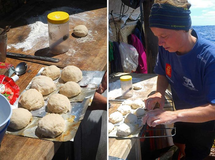 Пища готовилась на газовой плите, запас газовых баллонов был на 10 недель трехразового питания. Воды запаслись тоже на 10 недель, в среднем 15–18 литров уходило в сутки на семь человек экипажа, но спагетти и каши готовились не на чистой пресной воде, а в смеси с морской водой. Точно так же морская вода добавлялась в тесто для выпечки хлеба – а хлеб был всегда праздником на плотах! Вообще много было праздников за эти 72 дня, и даже день рождения капитана плота «Рахити Танэ» Сигнэ Мелинг, и тогда кухня наполнялась запахами сладкого: пеклись какие-то замысловатые булочки, пышки, лепешечки, все что угодно без названия, но принималось все это с неизменным успехом и поедалось мгновенно. Были запасы красного сухого вина, их берегли, старались растягивать до самого последнего момента, и если уж начиналось застолье, то на каждого выходило по 150 граммов.