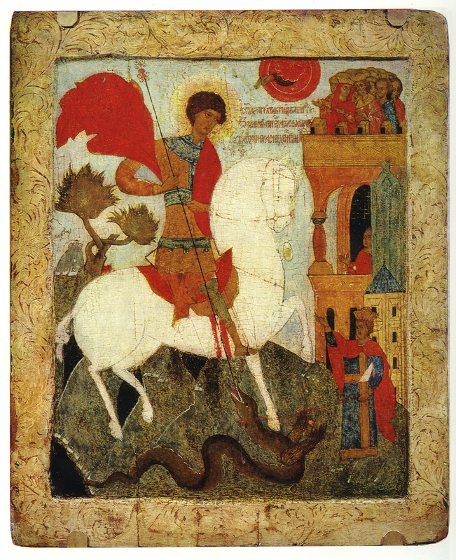 — Действительно, не нужно быть специалистом, чтобы сразу припомнить, насколько многочисленны изображения святого Георгия, оставленные нам древнерусской иконописью. Это и «портретные» иконы, и образа с многочисленными клеймами, иллюстрирующими житие и чудеса великомученика, изображения пешие и конные, иконы из деисусного чина иконостасов [1]… Разумеется, святой Георгий был не единственным угодником Божиим, пользовавшимся на Руси особой любовью и почитанием (наряду со святителем Николаем, пророком Илией, Флором и Лавром…), и даже не единственным святым воином — вспомним Димитрия Солунского, Феодора Тирона, Андрея Стратилата… Но, думается, «место» римского военачальника, ставшего истинно русским святым, всё же по-своему исключительно — настолько «общим» оказывается он для различных слоев населения Руси.
