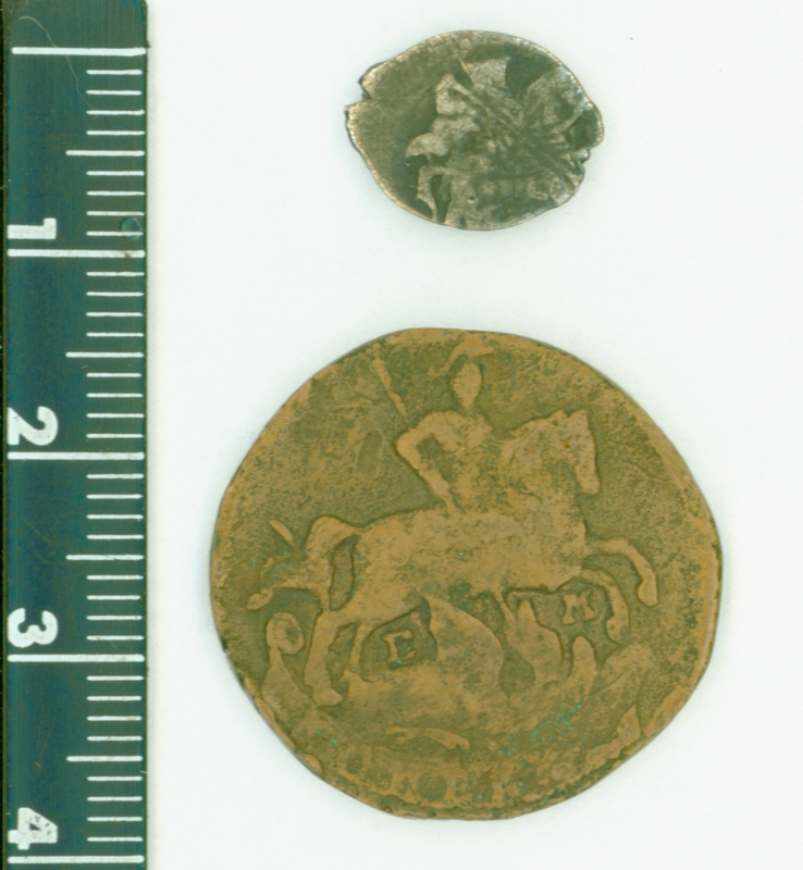 Копейки с царем-всадником (царствование Михаила Феодоровича, конец 1610-х гг.) и святым Георгием (царствование Екатерины II, 1789)