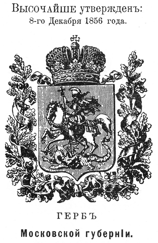 Претерпел изменения и рисунок самого святого Георгия. В XVIII веке он изображался в виде западноевропейского рыцаря, с ног до головы закованного в доспехи, в шлеме с открытым забралом и с турнирным копьем в руке. Теперь же облик Победоносца был сделан в каком-то смысле более «историчным» и, несомненно, более православным — он предстает в вооружении, условно говоря, «греко-римского» образца, в греческом шлеме с гребнем, а главное — копье святого Георгия теперь увенчано крестом (по описанию — осьмиконечным, но из-за недостатка места мог изображаться и четырехконечный крест). Согласно официальному описанию, московский губернский герб образца 1856 года представлял «в червленом щите, Святого Великомученика и Победоносца Георгия, в серебряном вооружении и лазуревой приволоке (мантии), на серебряном, покрытом багряною тканью с золотою бахромою, коне, поражающего золотого с зелеными крыльями дракона золотым с осьмиконечным крестом наверху копьем. Щит увенчан Императорскою короною и окружен золотыми дубовыми листьями, соединенными Андреевскою лентою»; описание городского герба образца 1883 года практически идентично, за исключением сопутствующих гербовому щиту «украшений»: «Щит увенчан Императорскою короною. За щитом два накрест положенные золотые скипетра, соединенные Андреевскою лентою (обозначавшие столичный статус Москвы. — А. К.)». В таком виде герб просуществовал до 1917 года.