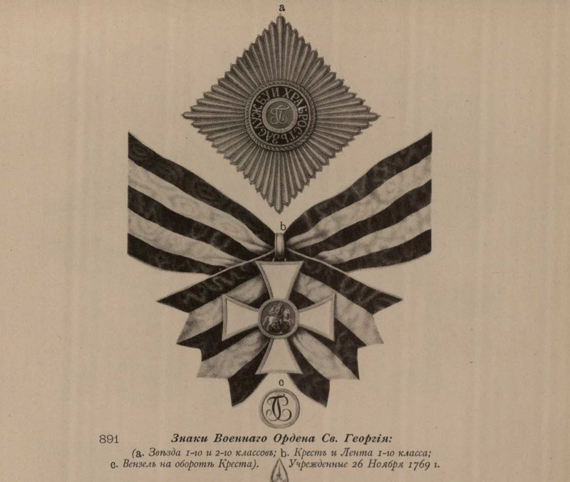 Знаки ордена Святого Георгия, учрежденные 26 ноября 1769 г.: а. Звезда 1-го и 2-го классов; б. Крест и лента 1-го класса; в. Вензель на обороте креста. Иллюстрация из труда А.В. Висковатова «Иллюстрированное описание одежды и вооружения Российских войск»