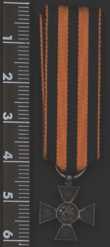 Миниатюрный (около 6 см вместе с ленточкой!) Георгиевский крест 4-й степени (подобные миниатюры изготовлялись для ношения на штатском платье). Из собрания Дома Русского Зарубежья им. А. Солженицына