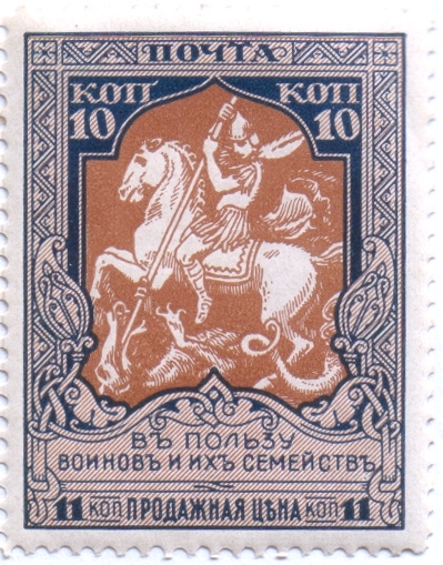 Почтово-благотворительная марка России из серии, отпечатанной по заказу Императорского женского патриотического общества (такие марки выпускались в 1914-1915 гг., художник Р. Зарин). С каждой проданной марки одна копейка отчислялась в пользу воинов действующей армии и их семейств