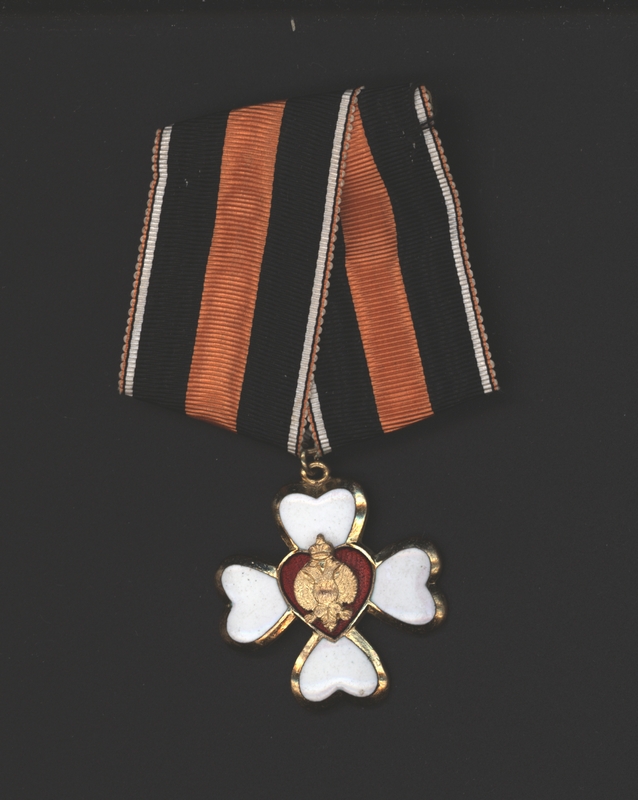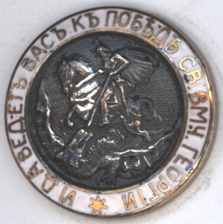 Нагрудный знак Общества русских ветеранов Великой войны (США). Девиз на знаке — цитата из последнего приказа Императора Николая II действующей армии и флоту: «Да благословит вас Господь Бог и да ведет вас к победе Святой Великомученик и Победоносец Георгий». Из собрания Дома Русского Зарубежья им. А. Солженицына