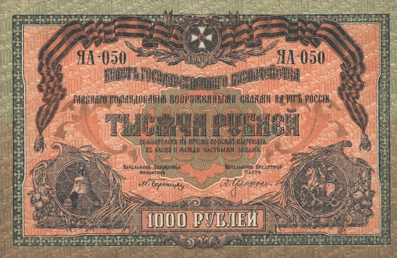 Казначейский билет Главного командования Вооруженными силами Юга России, в обиходе именовавшийся «ленточкой». Симферопольская экспедиция заготовления государственных бумаг, 1919–1920