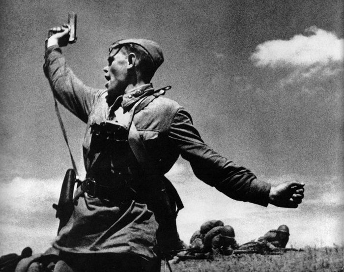 Известная фотография молодого командира в пилотке, который встает из окопа в полный рост с пистолетом и зовет за собой солдат. Я где-то читал, что это его предсмертная фотография. Командира застрелили в следующую секунду после того, как сделали снимок. Вот в чем дело…