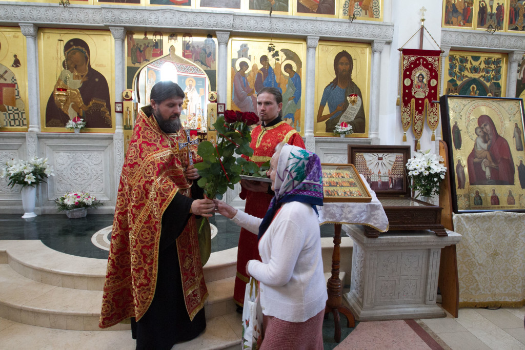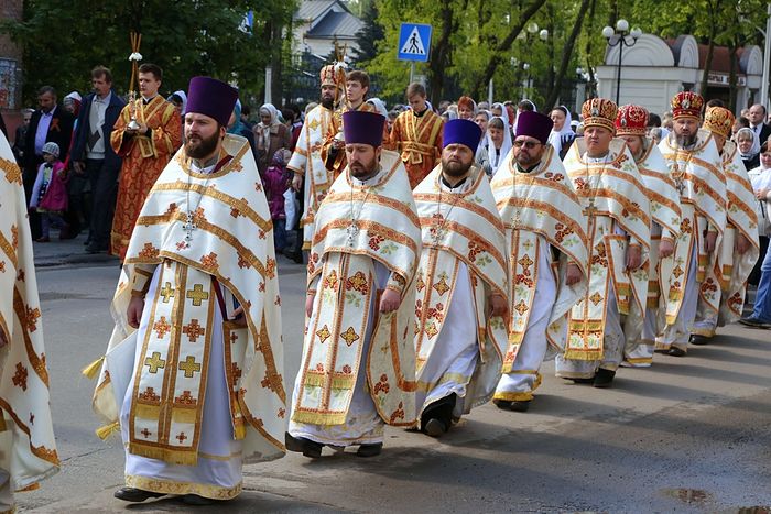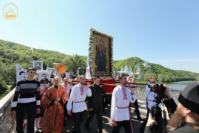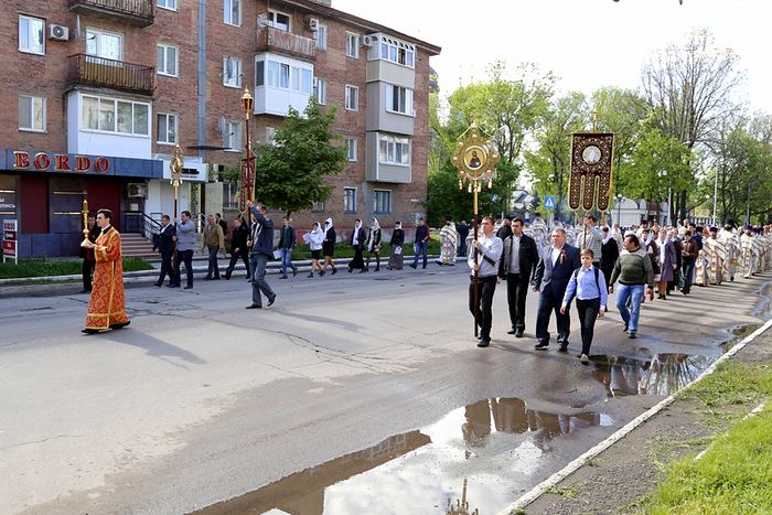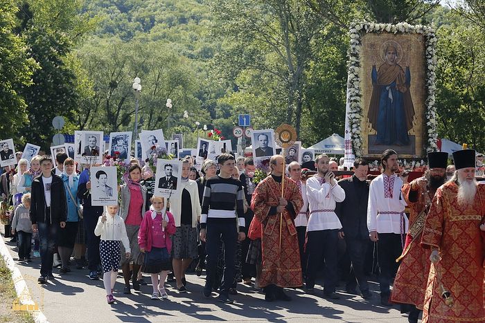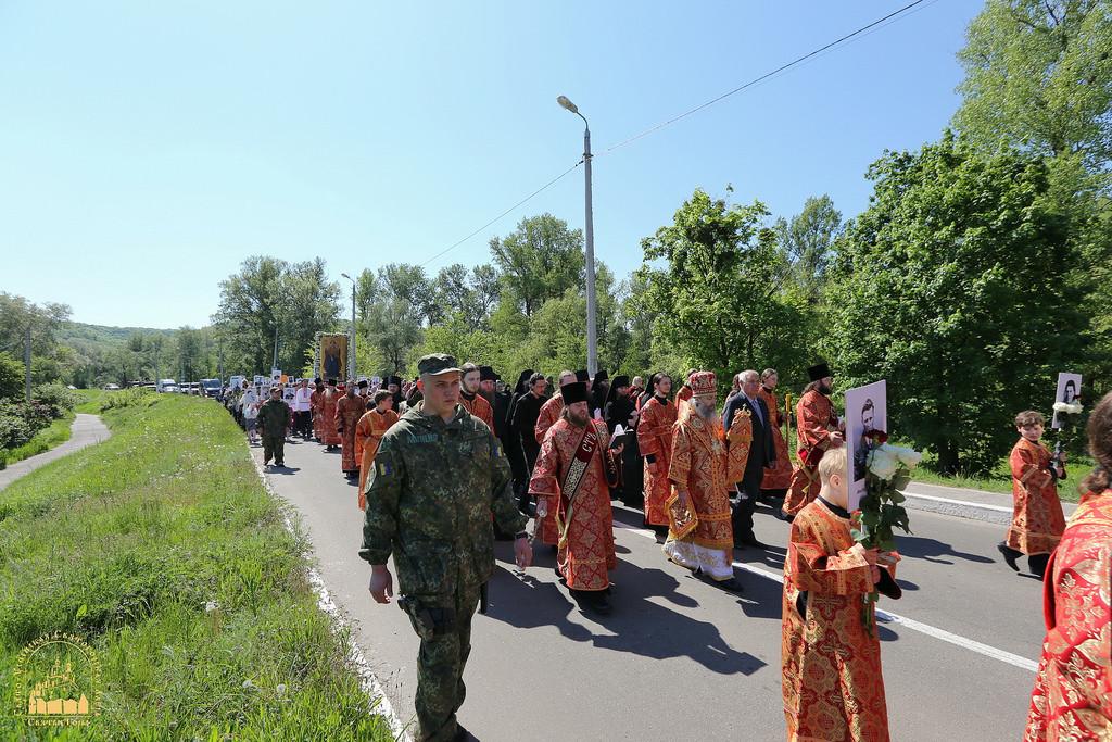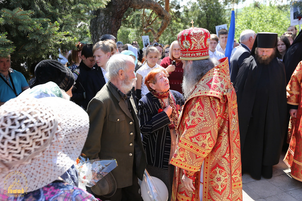 По окончании Божественной литургии начался крестный ход из обители в центр города Святогорска на Холм Славы, где была отслужена панихида. Во время крестного хода пели пасхальные песни и служили молебен с акафистом Божией Матери перед иконой «Несокрушимая Стена». Кроме хоругвей, некоторые участники крестного хода несли фотографии ветеранов Великой Отечественной войны, которые принимали участие в боях за Святогорье, а также тех, кто был родом из этих мест.