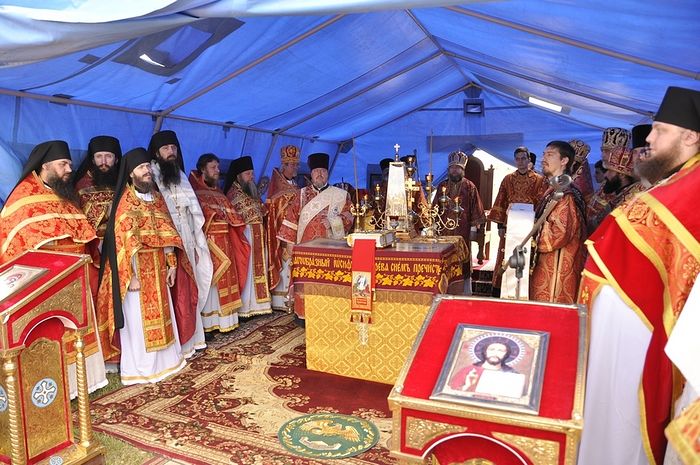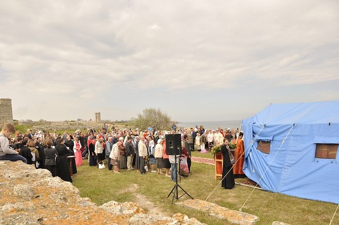 Утром епископ Егорьевский Тихон (Шевкунов) совершил служение Божественной литургии в базилике апостола Петра («Уваровская базилика» на территории национального заповедника «Херсонес Таврический»).