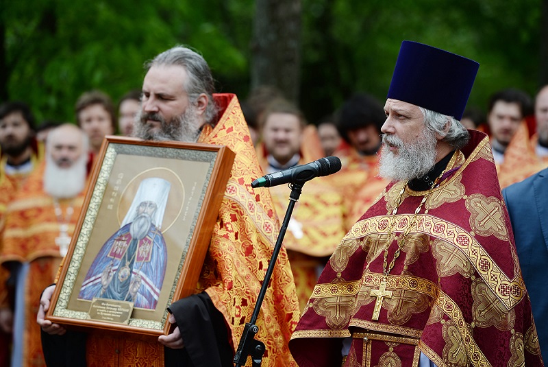 Настоятель храма на Бутовском полигоне протоиерей Кирилл Каледа приветствовал Святейшего Владыку и преподнес Его Святейшеству икону священномученика Серафима (Чичагова).