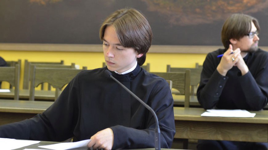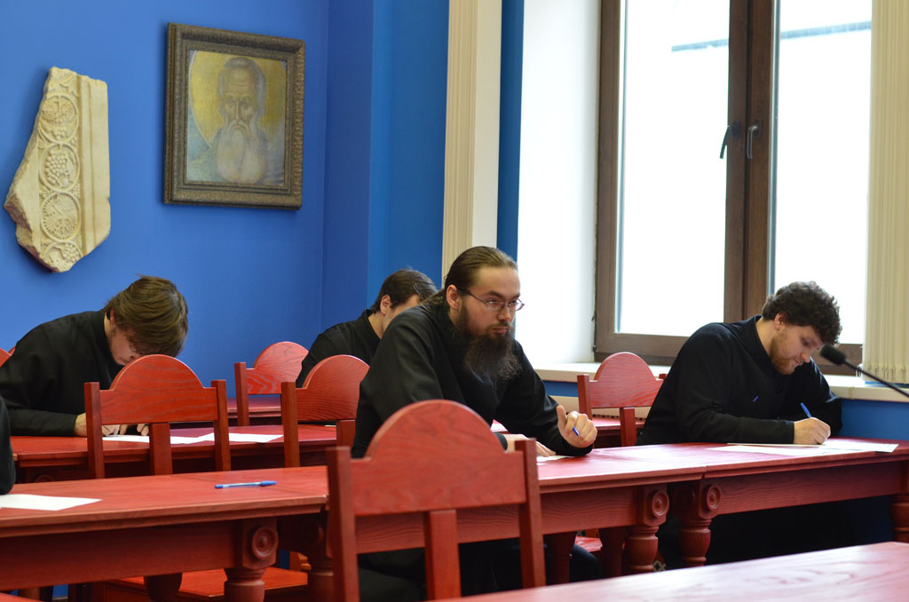 На улице пасмурно. В Сретенской семинарии впервые в истории духовных школ в волнительной атмосфере сдачей единого междисциплинарного экзамена начались итоговые испытания. Прежде выпускники семинарий только защищали подготовленные ими научные работы, с этого года всем тем, кто оканчивает духовные учебные заведения, предстоит подтвердить свои знания на едином итоговом экзамене.