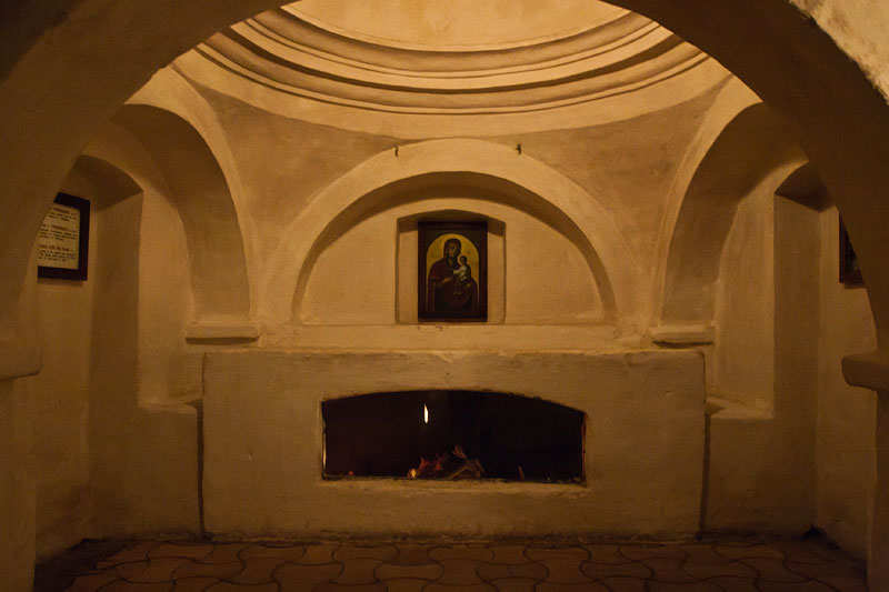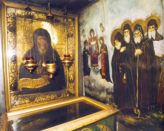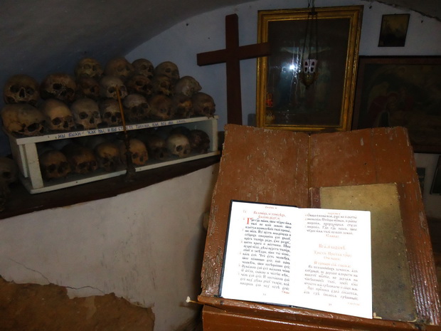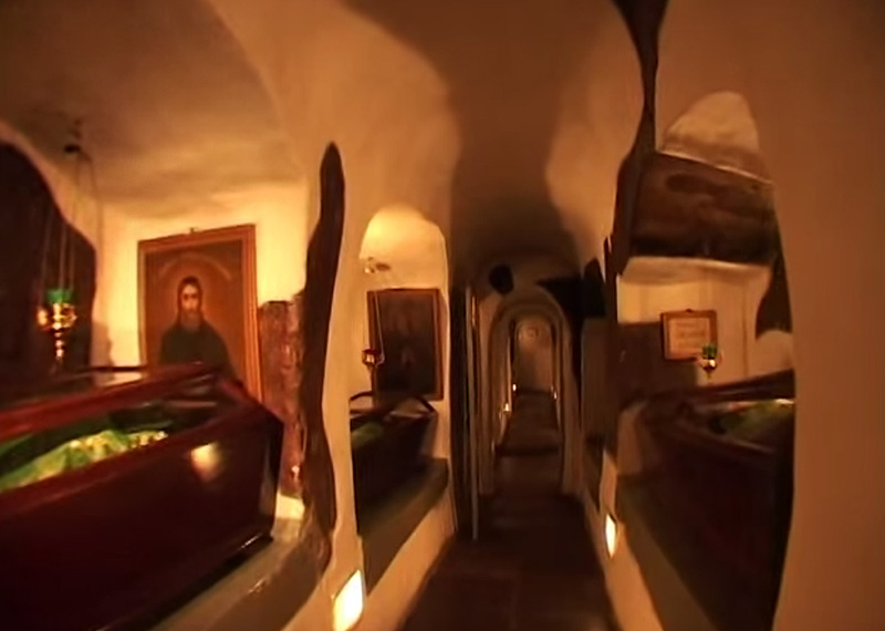 Костница, как правило, во всех монастырях Афона устраивается в нижнем, полуподвальном этаже кладбищенского храма в виде пещерного погребального грота, где иноки читают в уединении псалтирь об усопших братиях и упражняются в памяти смертной. (Эсфигменская псевдо-пещера тоже очень похожа на погребальный грот, хотя таковым не является.) Вспомним, что и в Киево-Печерской Лавре пещеры с самого начала служили местом погребения усопших монахов и со временем стали своеобразной усопохранительницей.