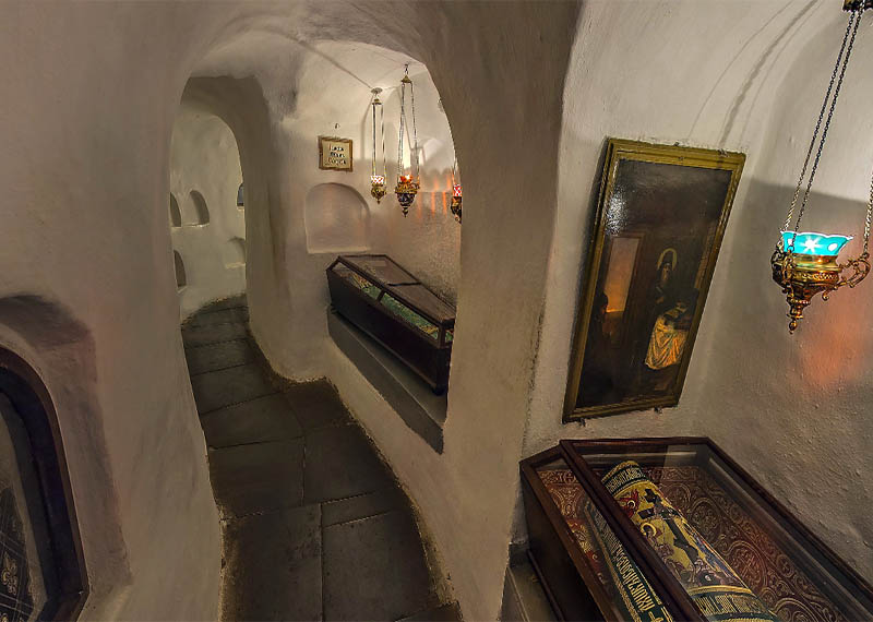 Пещера — не цель подвига, а лишь средство, и притом одно из многих. Целью, ради которой преподобный Антоний и его последователи удалялись в пещеру, было уединение, изоляция от мира, погружение в память смертную, жизнь в собственной гробнице прежде смерти. Скорее всего, отдаленным прообразом Киевской пещеры на Святой Горе можно считать монастырскую усопохранительницу (костницу).