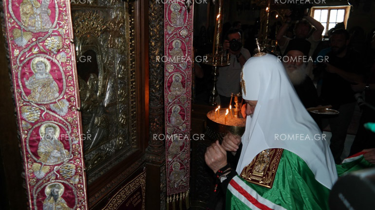 В соборном храме Протата Патриарх поклонился чудотворному образу Пресвятой Богородицы «Достойно есть». После чего был отслужен краткий молебен.