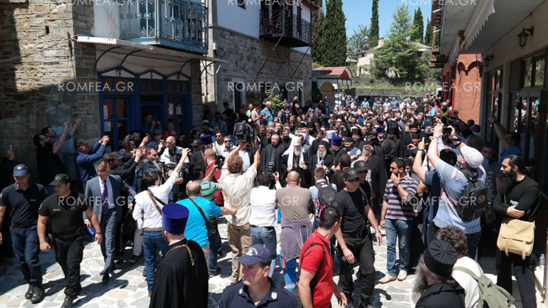 Предстоятеля Русской Православной Церкви встретили протоэпистат Святой Горы старец Павел Лавриот, представители всех афонских монастырей, множество монахов и паломников.