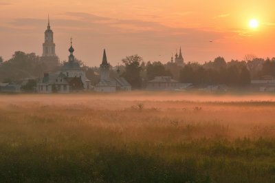 Представитель профессионального сообщества пиарщиков москвич Николай Сапронов помимо собственного фотографического хобби теперь выступает еще и организатором проекта «Душа России» — серии выставок, популяризирующих природные пейзажи с известными православными храмами. На Патриаршем мосту Николай выставил запечатленную им панораму, знакомую каждому, кто хоть раз бывал в Суздале. Это вид с вершины Ильинского холма на заповедную пойму Каменки (Илл.3). Над Кожевнической слободой нависает высочайшее в городе сооружение — 72-метровая Преподобенская колокольня Ризоположенского женского монастыря. Луг окружают слободские храмы Богоявления Господня и Рождества Иоанна Предтечи, вдали угадываются знакомые очертания Антипиевской и Лазаревской церквей... Птичьи силуэты привносят в предрассветную тишину необходимую толику динамики. «Как часто бывает, эта фотография — дело случая. Я хотел приехать в Суздаль вечером, но из-за ремонта дороги за рулем провел всю ночь до четырех часов утра, — вспоминает Николай. — Возможно, за это Господь и наградил меня потрясающим видом!»