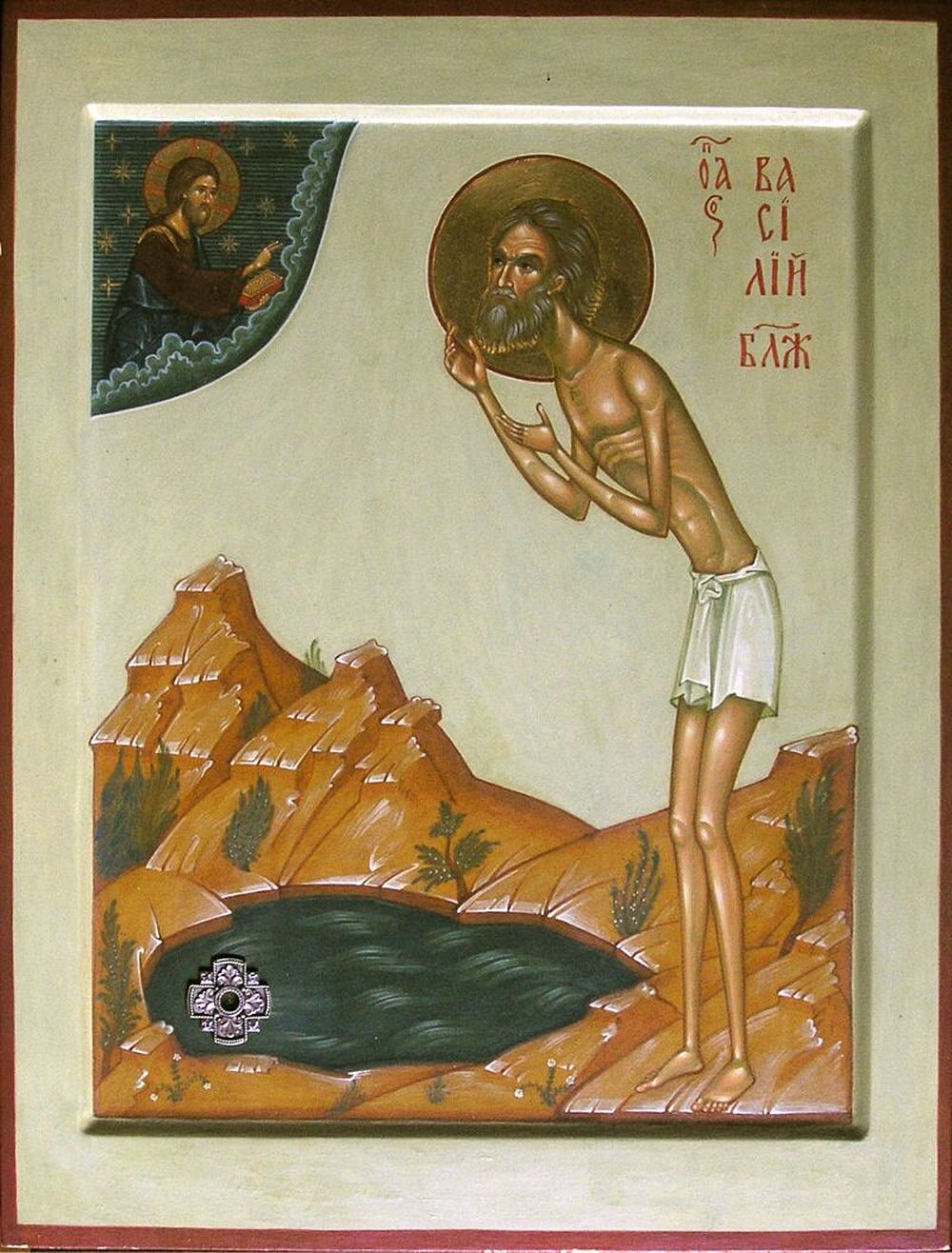 С тех пор Василий стал скитаться по городу, всегда нагой, не имея крыши над головой и постоянного пропитания. Житие повествует: «В продолжение всей своей подвижнической жизни он всегда имел пред своими глазами страшный день воздаяния Господня и не носил никакого одеяния, но пожелал быть всегда нагим, как бы уже предстоящим нелицемерному судилищу Сына Божия. Ни зимою, ни летом никогда не имел он у себя крова, ни даже какого-либо малого вертепа, то есть пещеры, но страдал от мороза и от палящего зноя».