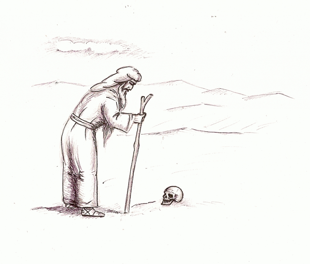 «В другой раз преподобный Макарий шел по пустыне и нашел высохший человеческий череп, лежавший на земле. Повернув его своим жезлом, преподобный услыхал, как будто он издал какой-то звук. Тогда Макарий спросил череп: