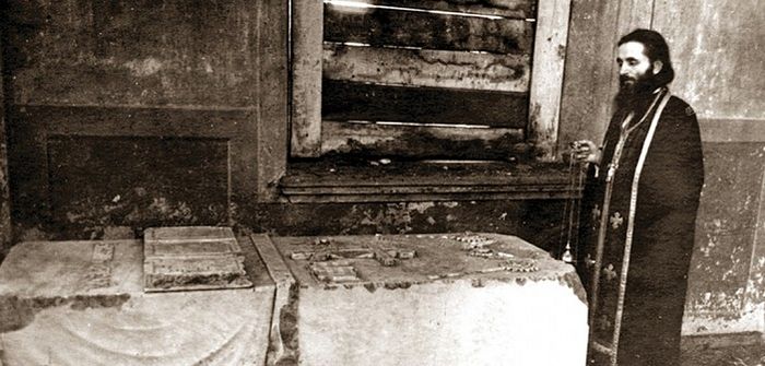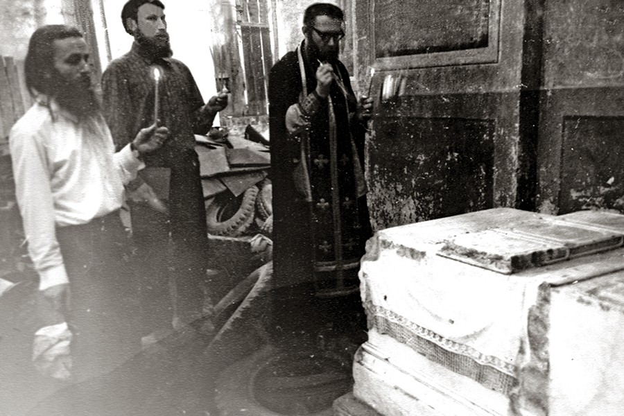 Было темно, светили фонариком. Провозились часа четыре. Потом увидели разломанный гробик. Он был развален на четыре части. Разбирая далее, мы увидели, что голова у святителя разбита на три части. Наверно, бросали что-то тяжелое. Собрали все косточки, каждый суставчик, позвонок. Потом нашли Евангелие, как новенькое: листочки белые-белые, печать чистая. Полностью сохранилось! Только вот если в руки его взять, страницы ломались.