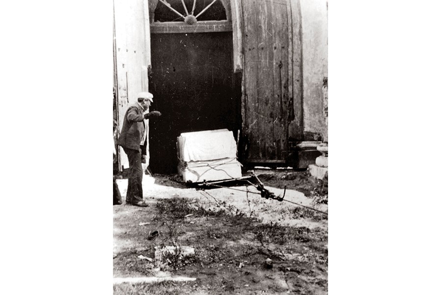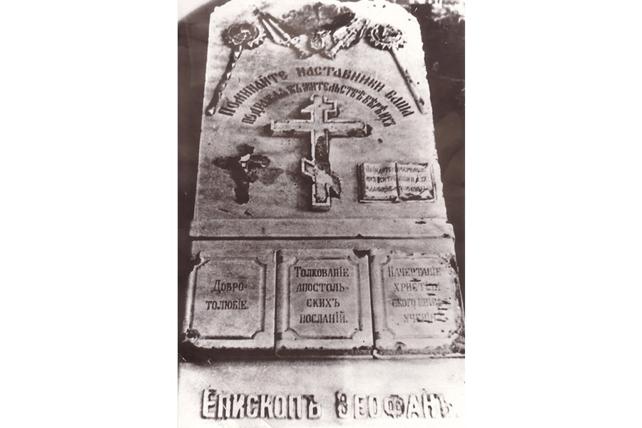 Обретя мощи, мы вскоре перевезли мраморное надгробие весом в 6,5 т. На нем были высечены митра, рипиды и три книги: «Добротолюбие», «Толкование Апостольских Посланий» и «Начертание христианского нравоучения». При помощи военной машины с лебедкой вытащили надгробие, оно такое тяжелое, что толстенные тросы рвались! Я даже подумал, может, воли Божией нет, но надгробие поддалось, уложили его на лист железа, и так по песку, асфальта тогда не было, привезли в Эммануиловку. Есть фотография, как местные детишки моют его. В настоящее время надгробие находится под престолом придела в честь святителя Феофана в храме Преподобного Сергия в Эммануиловке.
