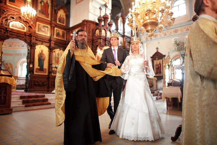 Кстати, некоторые элементы венчания очень схожи со священнической хиротонией: священника так же водят вокруг престола, как супругов водят вокруг аналоя, и поют такие же песнопения, только немножко в другом порядке. Как священник венчается Церкви, так и жених венчается своей невесте.