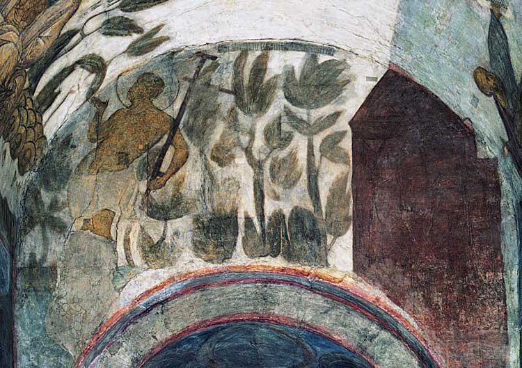 Даниил. Райские врата и благоразумный разбойник. Фреска западной люнеты в южном нефе. Владимир, Успенский собор. 1408 г. А нравственность ведь вещь достаточно простая, требования здесь ясные, четкие и понятные, они касаются поведения человека в этом мире и его отношения к этому миру. Они же совершенно очевидны, эти отношения: нельзя убивать, нельзя красть, нельзя причинять зло человеку… Христианство говорит: «Нет, дело не просто в нравственности». И указывает на Евангелие. Кто распял Христа? Исполнители нравственного закона иудейской религии! Они оказались отверженными от Бога, предателями Бога. Кто первый спасся? Это невероятный парадокс: преступник и бандит. Оказывается, условием вхождения в вечность является не просто нравственность. Человек может быть нравственным, исполнять все нравственные предписания, но это может быть человек с такой гордыней, с таким самомнением, с таким тщеславием, с такой завистью! Это страсти, которые внутри нас. Это характеристики его духовного состояния. Вот христианство и говорит: для достижения вечной жизни требуется не просто нравственность.
