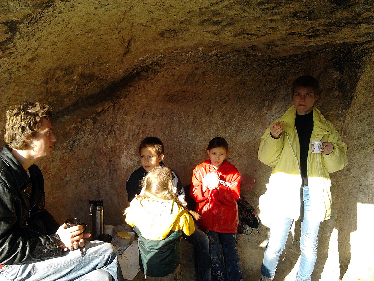 Я оставляю папу следить за порядком (и он, как всегда, вносит какое-нибудь непредсказуемое новшество, а если быть точным – что-нибудь давно забытое советское, в игру современных детей), а я удаляюсь в уютную пещерку сервировать стол. Похоже, это единственное тихое место во всем городище. Можно наслаждаться покоем. Прямо на каменном ложе я расстилаю скатерку, раскладываю бутерброды и разливаю по стаканчикам сладкий чай. Катя вызывается мне помогать. Мы с удовольствием обсуждаем планы на лето. Эти минуты за трапезой на природе я люблю больше всего. Стол накрыт! Все собираются вместе. Это неизменно вызывает прилив воспоминаний: каждый рассказывает что-нибудь интересное, связанное с горами, и почему-то все эти случаи вызывают приступы самого искреннего смеха.